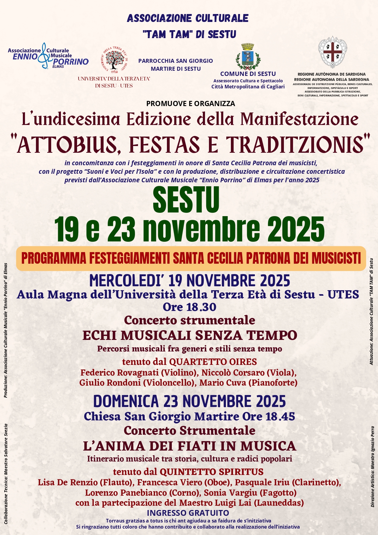 Si avvisano tutti gli interessati che il 19 e il 23 novembre 2025, presso rispettivamente l’Università della Terza Età di Sestu e la chiesa di San Giorgio, si terrà l’11ª Edizione della manifestazione “Attobius, Festas e Traditzionis”.
