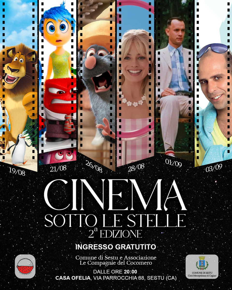 Il Comune di Sestu, in collaborazione con l’associazione Le Compagnie del Cocomero, offre la 2ª Edizione della rassegna “Cinema Sotto le Stelle” che si terrà dal 19 agosto al 3 settembre 2025, presso lo spazio all’aperto della struttura comunale “Casa Ofelia” sita in via Parrocchia n. 88.