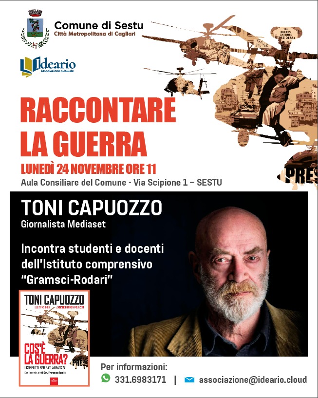 Si avvisano tutti gli interessati che il 23 novembre 2025, alla ore 18:15, presso l’Aula Consiliare del Comune di Sestu, sita in via Scipione n.1, si terrà il Convegno “Raccontare la guerra – I Conflitti attraverso le parole e le testimonianze di chi li ha vissuti”, con il giornalista Toni Capuozzo.