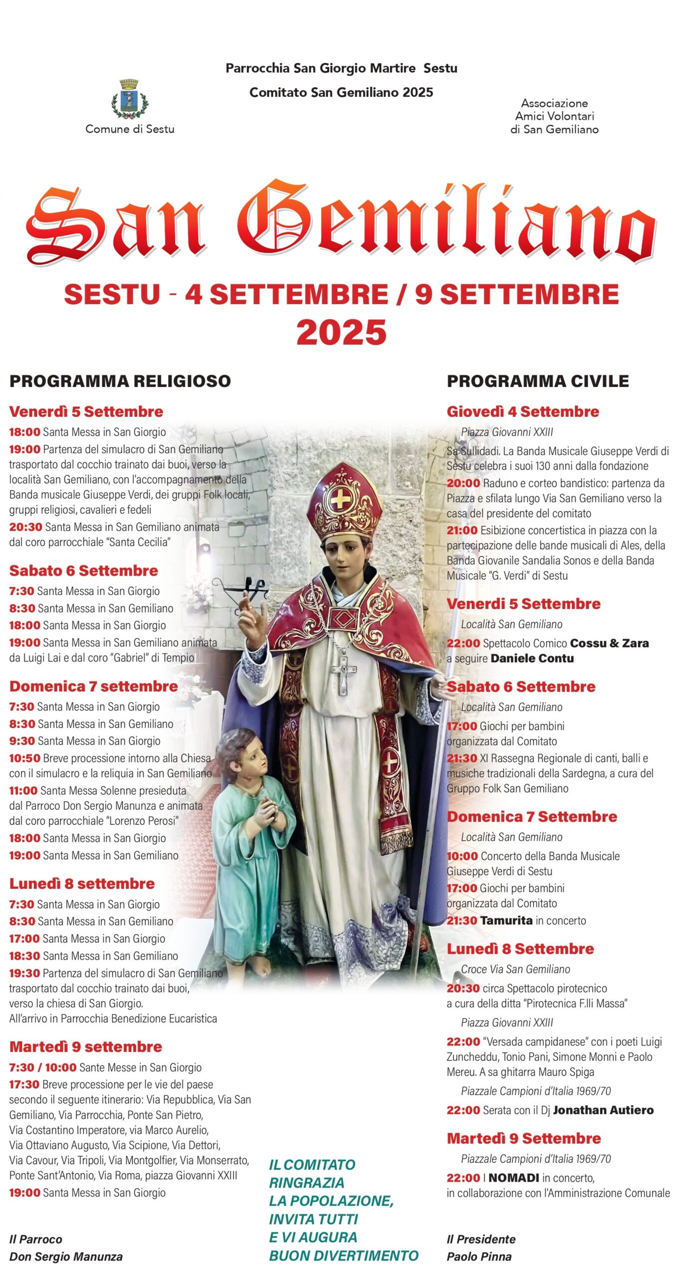 Si avvisano tutti gli interessati che dal 4 al 9 settembre 2025 si terranno i festeggiamenti religiosi e civili in onore di San Gemiliano.