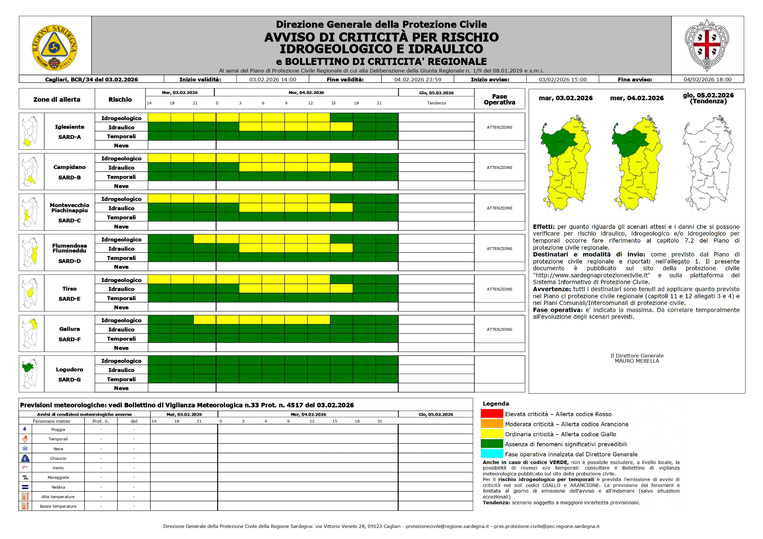 codice GIALLO (criticità ORDINARIA) per RISCHIO IDRAULICO e RISCHIO IDROGEOLOGICO sulle aree di allerta Iglesiente, Campidano, Montevecchio Pischinappiu, Flumendosa Flumineddu, e Tirso.