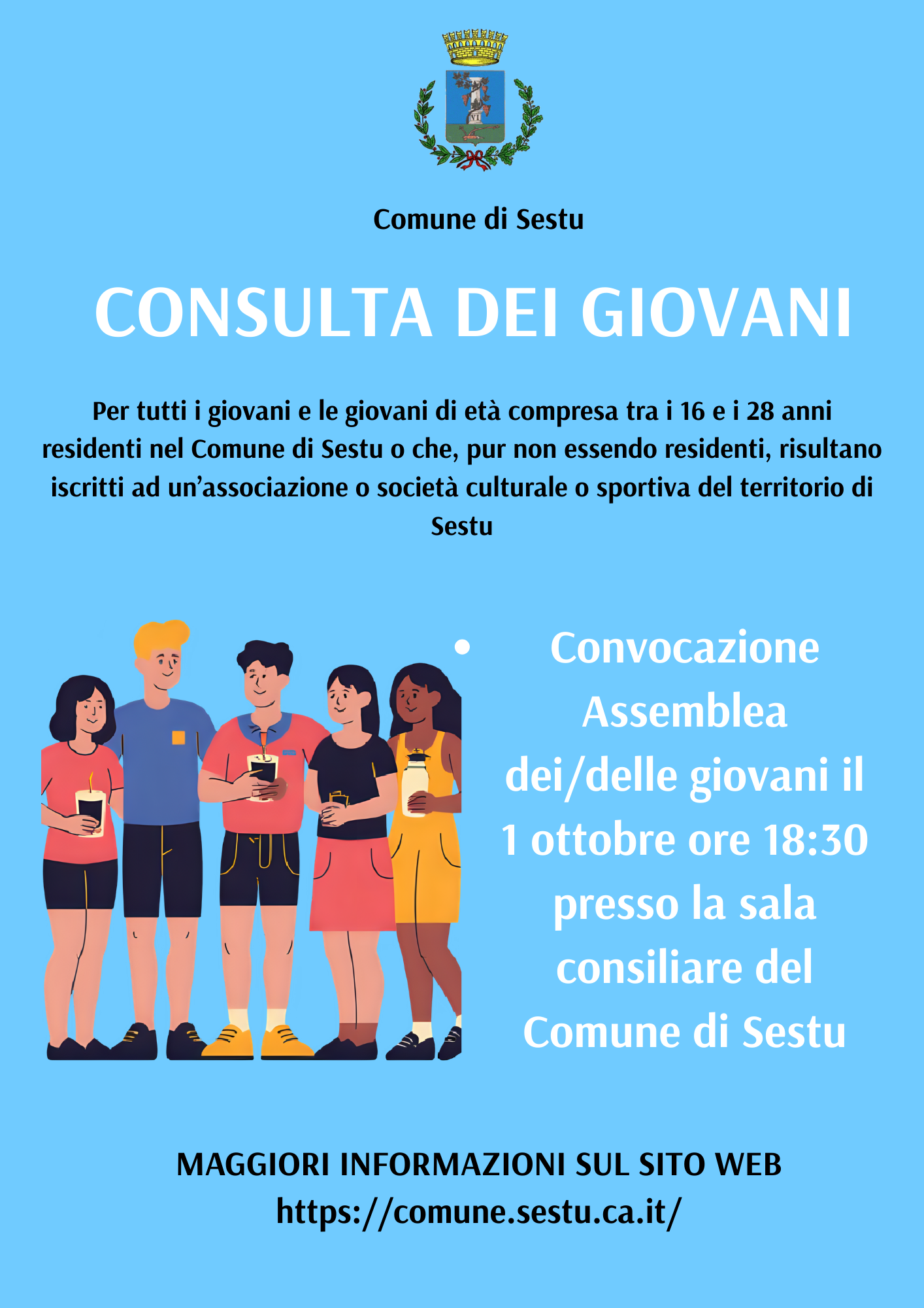 Si informano tutti/e gli/le interessati/e che che l’Assemblea dei/delle giovani, avente il compito di eleggere i membri della Consulta dei giovani, è convocata per il giorno mercoledì 1 ottobre 2025 dalle ore 18:30 alle ore 20:30 presso l’aula consiliare sita in via Scipione 1.