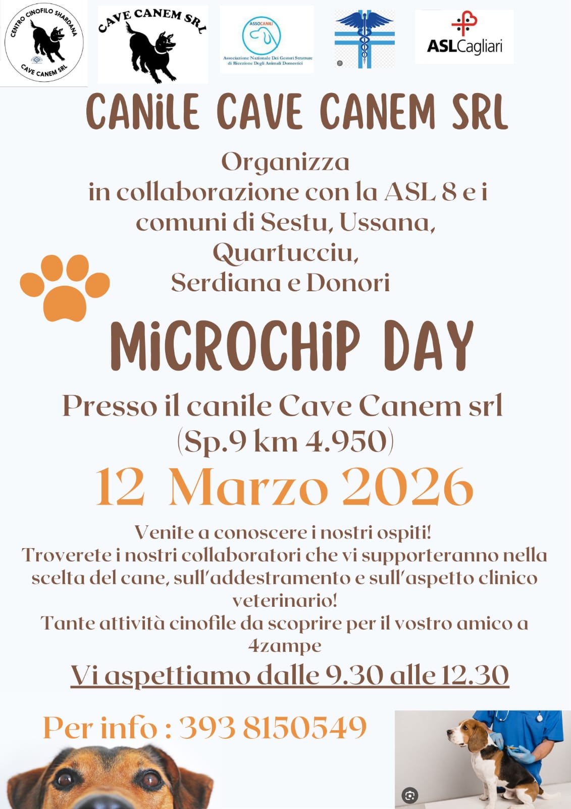 Il Comune informa che il 12 marzo 2026, dalle ore 9.30 alle 12.30, si terrà la campagna di microchippatura gratuita per cani, promossa dal Canile Cave Canem Srl in collaborazione con la Asl 8 e i Comuni di Sestu, Ussana, Quartucciu, Serdiana e Donori.
